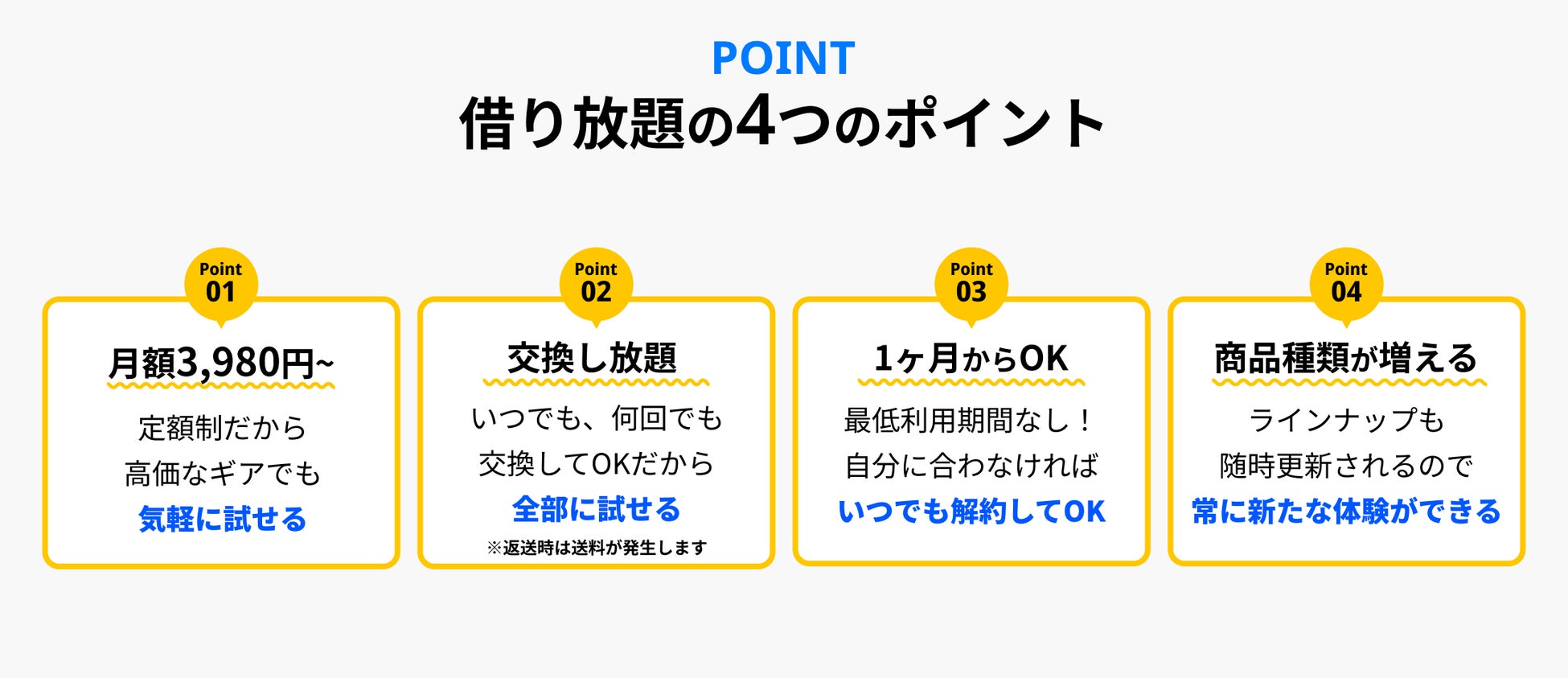ご利用期間中は、いつでも、何回でも交換し放題。使わなくなったらいつでも解約OKなので気軽に様々なアイテムを試すことが可能です。