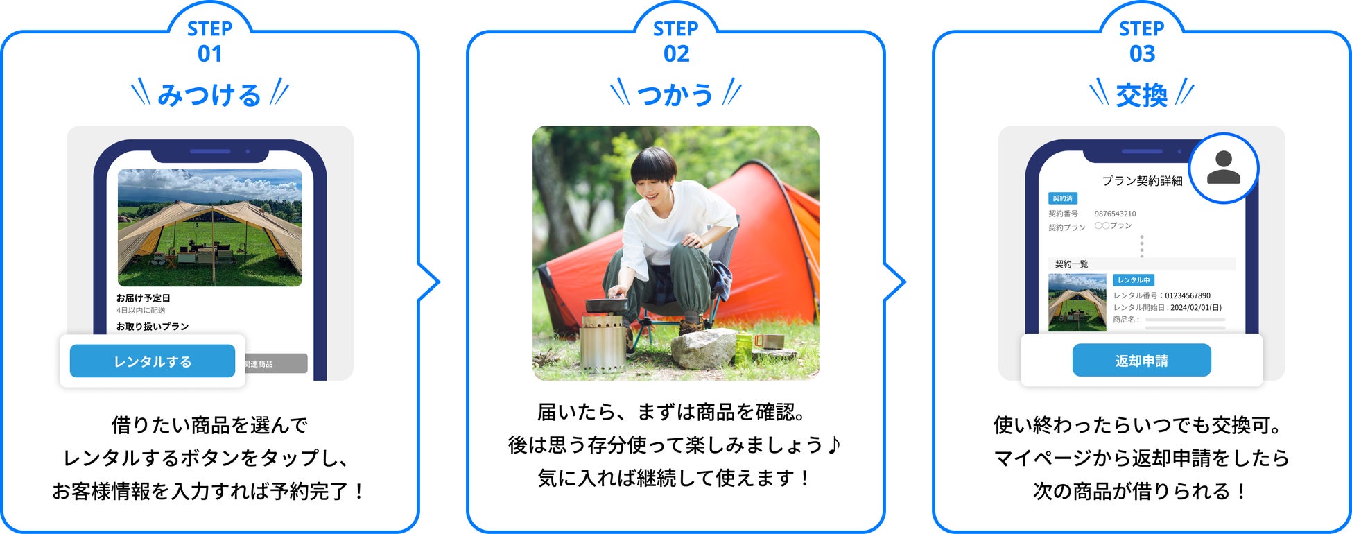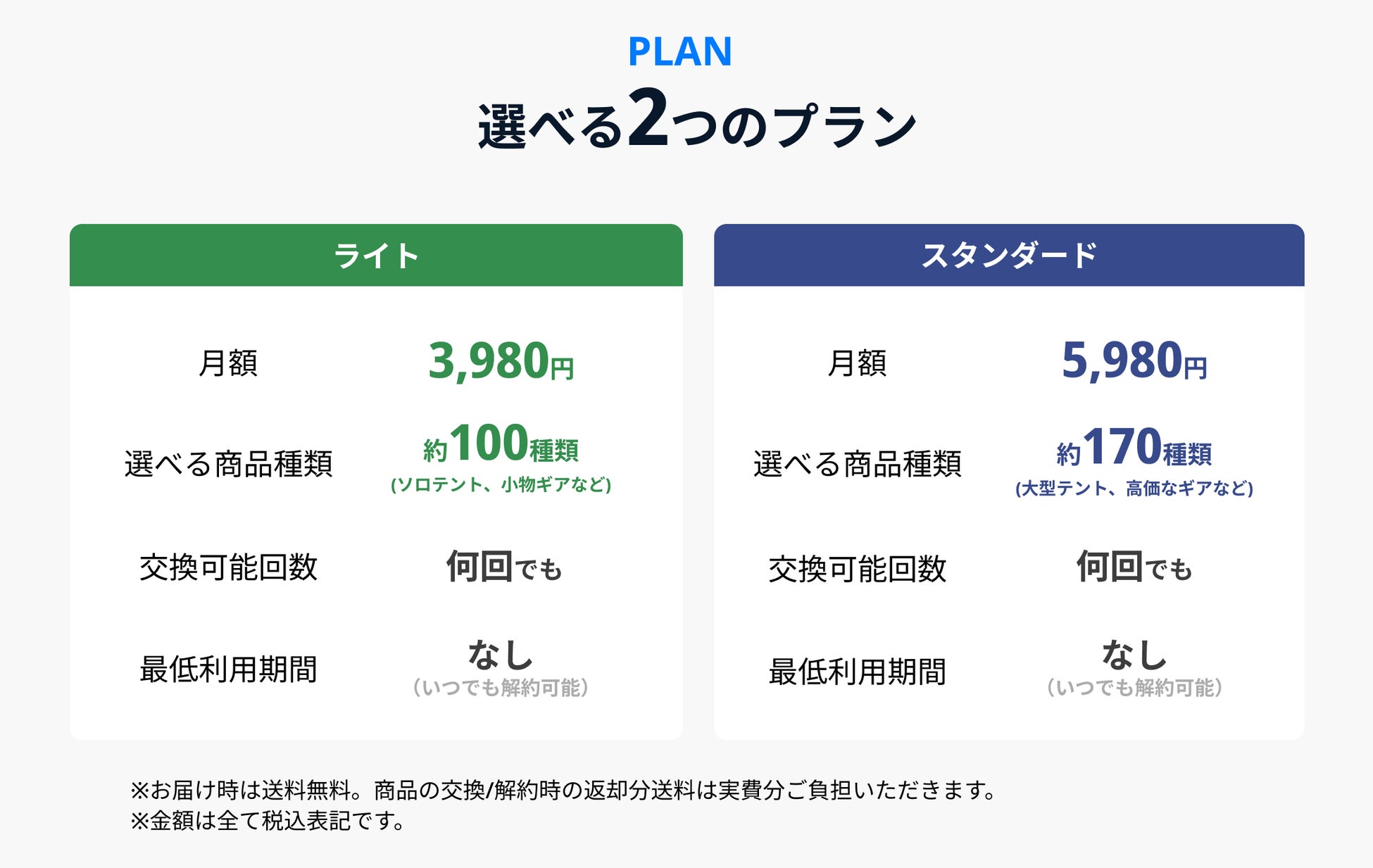 定番ギアや初心者向けキャンプセットを中心とした従来のレンタルサービスに対し、より頻繁にキャンプをする、中/上級者キャンパー様にもお楽しみいただけるサービスとなっています。