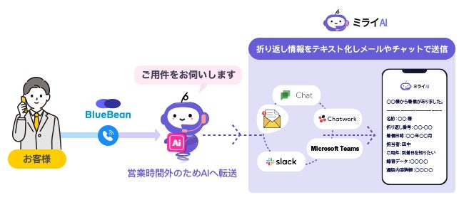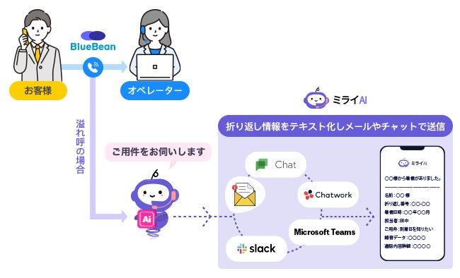 そのような場合、BlueBeanとミライAIを組み合わせれば、待ち呼やあふれ呼はAIが折り返しの旨をお伝えし、連携したメールやチャットで共有、入電が落ち着いた後に折り返し対応を行うことができます。