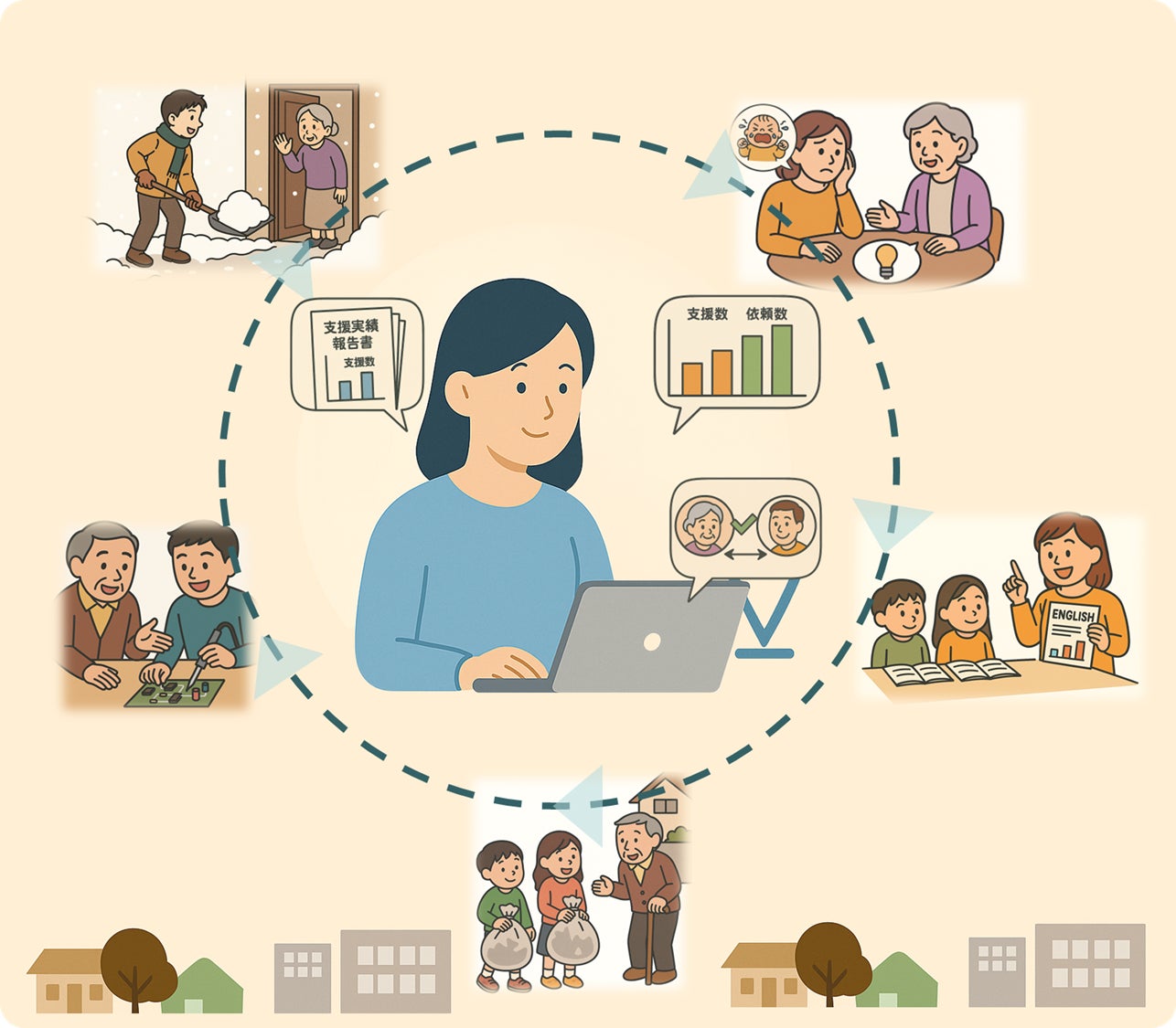 といった、一連の業務が、団体や自治会の運営者(以下、運営者)に集中しやすく、また、属人化・高齢化、報告業務の負担が大きいという課題があります。しかし継続的な助け合い活動や、「支援したい」「助けてほしい」という声を地域の中で循環させるためには、運営者の存在は必要不可欠です。