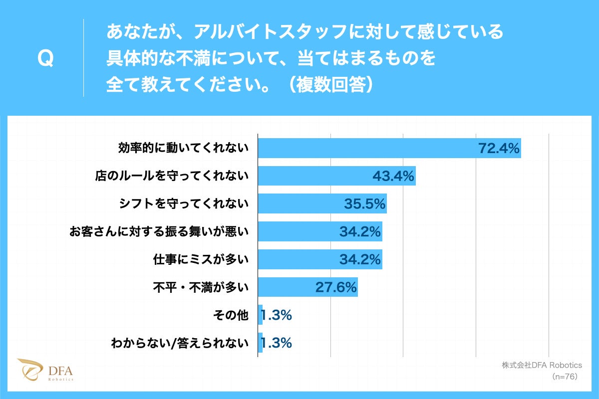 また同調査では、アルバイトスタッフを複数名マネジメントしている飲食店店長の7割以上がアルバイトスタッフに対して「不満がある」と回答しました。