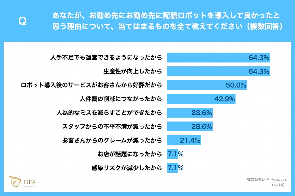 具体的には、「人手不足でも運営できるようになった」(64.3%)「生産性が向上した」(64.3%)などのメリットを実感していることが明らかとなりました。