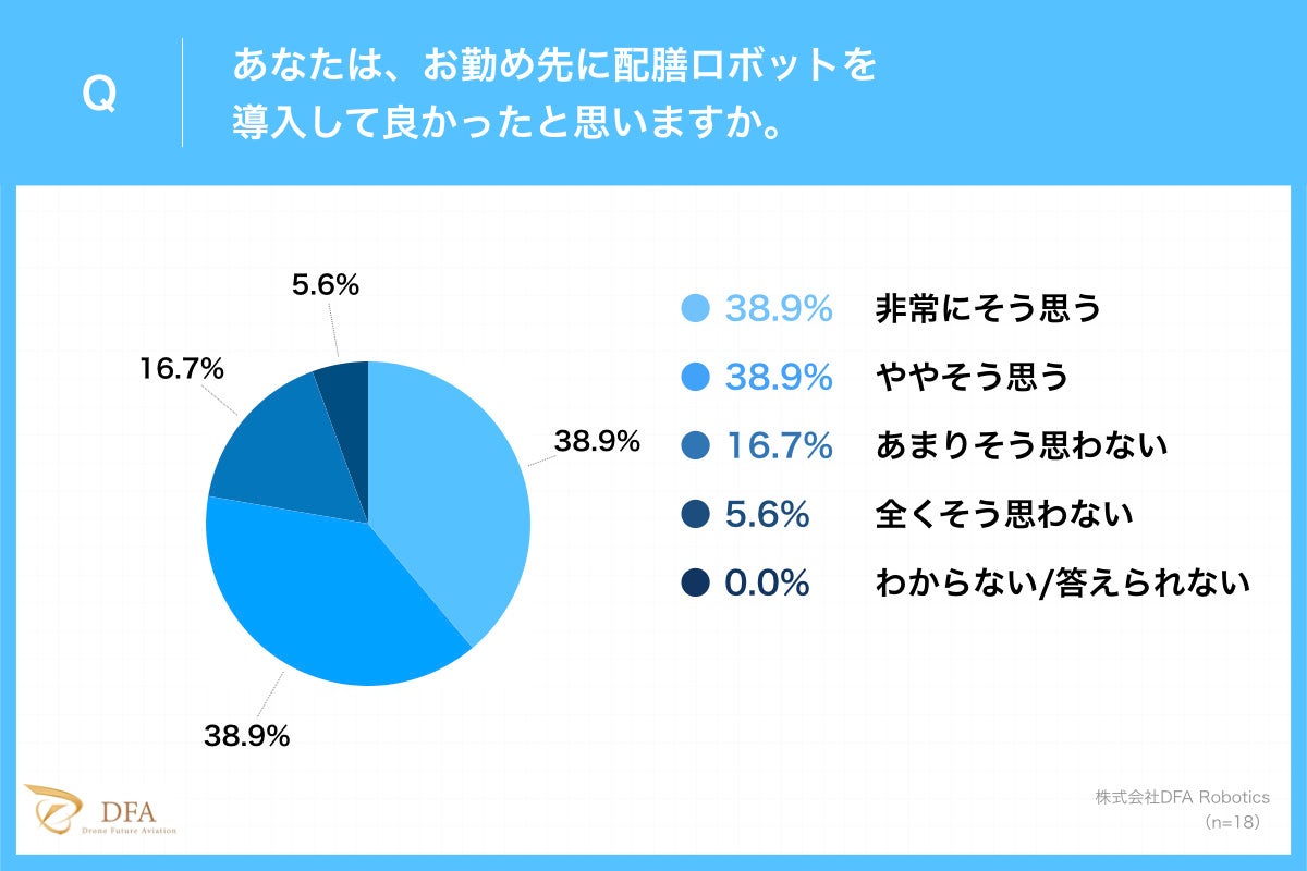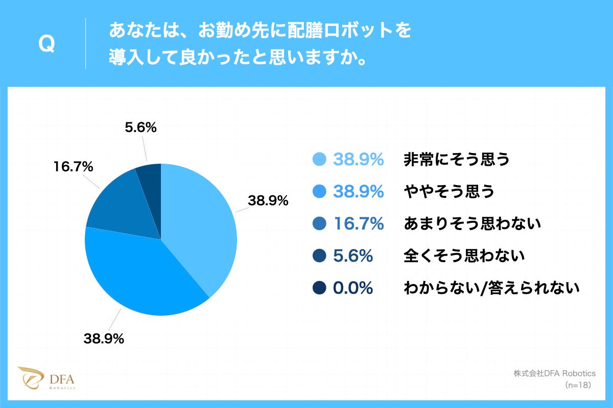 当社が行った飲食店店長に向けたアンケート調査において、「勤務先の飲食店で配膳ロボット導入しているか?」という質問に対し、「導入している飲食店」は17.1%の2割弱とまだ少ないながらも、「導入して良かったと思いますか?」の質問に対し、約8割が「導入して良かった」(「非常にそう思う」38.9%、「ややそう思う」と回答しています。