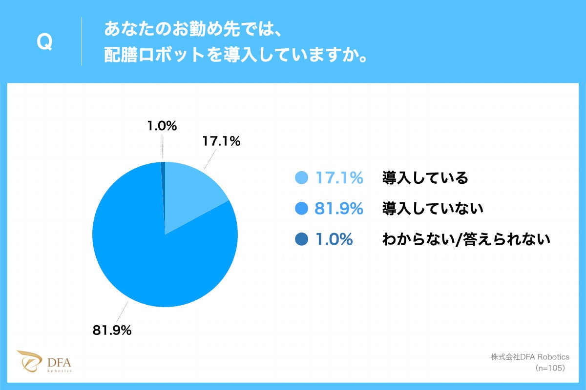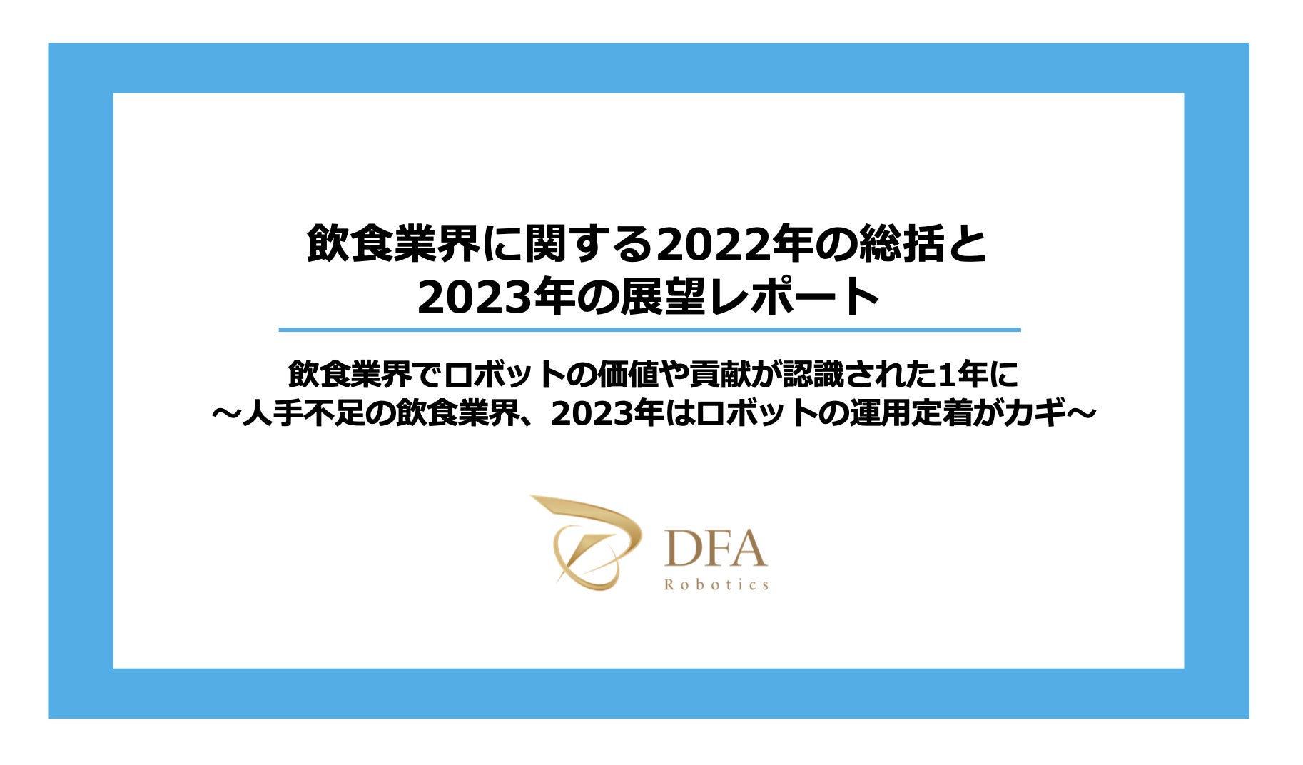飲食店DXを推進するロボティクスソリューションカンパニーである株式会社DFA Robotics(東京都渋谷区、代表取締役 波多野 昌昭)は、飲食店の配膳ロボットおよびアルバイトスタッフについてアンケート調査を飲食店店長105名に行い、その結果と共に、飲食業界の抱える課題とアルバイト探しのトレンド、またサービスロボット活用について「飲食業界に関する2022年の総括と2023年の展望レポート」を発表したことをお知らせいたします。