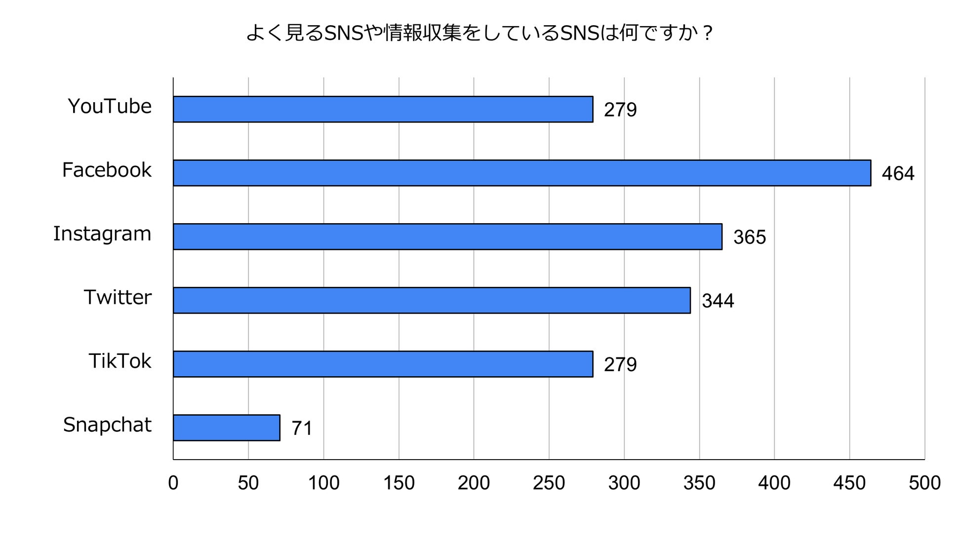 Facebookはいまだに海外では根強い人気を誇ります。またTikTokが急激に情報収集SNSとして使用されるようになっており、ショート動画の需要が高いことが窺えます。