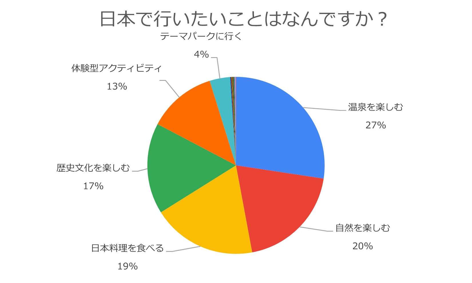 ・日本に訪れた際に「温泉を楽しみたい」「自然を楽しみたい」「日本料理を楽しみたい」ユーザーが多い結果に