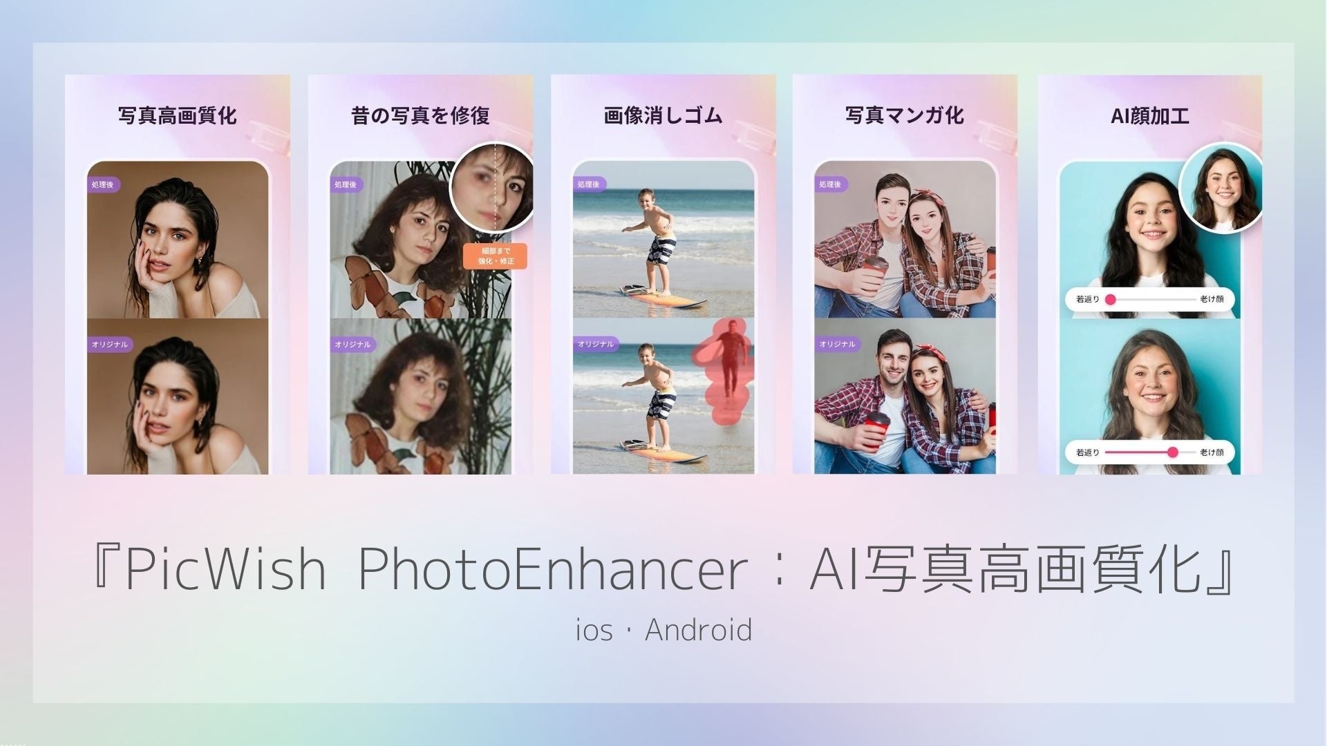 『PicWish PhotoEnhancer:AI写真高画質化』アプリ:写真高画質化・画像消しゴム・老け顔・若返り・AI写真漫画風加工