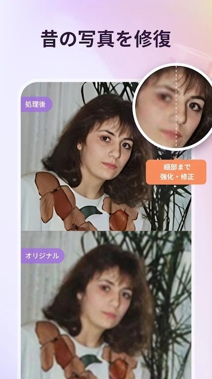 古い傷んだ写真を修復し、美しく仕上げる肖像画修復技術が搭載されます。 粒状感のある画像の画質を向上させます。 10年前の写真でも気軽に修復できます。