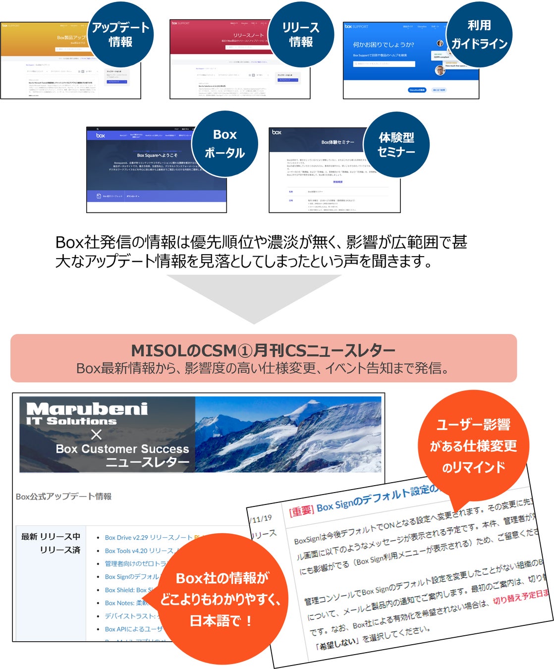 丸紅ITソリューションズは、代理店による支援がBoxの導入と運用の成功に大きな役割を果たすと考え、導入支援やCSMサービスを通じて、企業のセキュリティポリシーとガバナンスルールへの適合に必要な知見を蓄積し、Boxエコシステムソリューションとしてサービス化してきました。Boxサービスを国内市場に最適化し、お客様の事業環境に合わせてご活用いただくためのサービスを提案します。