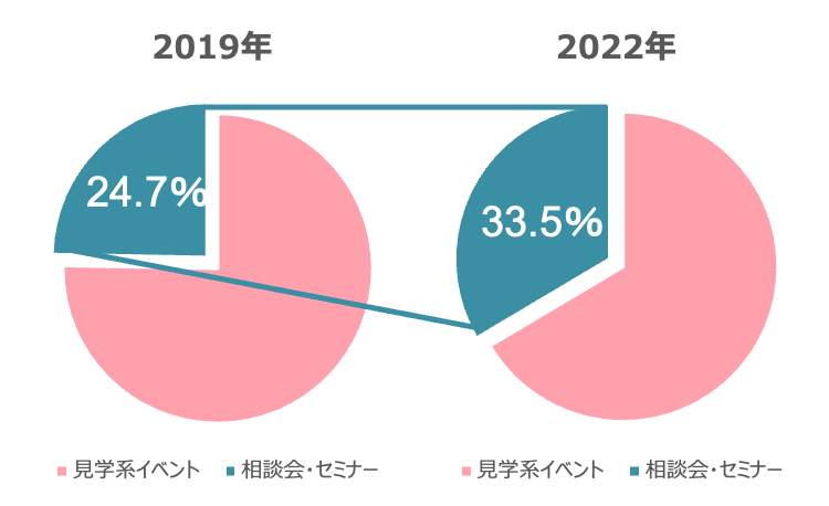 KengakuCloudにおける2019年と2022年のイベント種類別予約件数を比較すると、完成見学会は46.3%→27.3%に、モデルハウス見学は25.2%→13.1%に減少しています。反対に、相談会は7.5%→10.6%に、ワークショップは1.7%→7.6%に増加しています。また、2019年には0%だったオンラインセミナーは2021年に6.4%まで増加したものの、コロナ禍の自粛ムードが薄れたことで2022年には2.3%に留まっています。