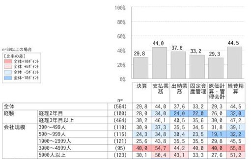 - 62.9%の企業が経理領域のDXを推進しており、推進している企業ほど出勤率が低い