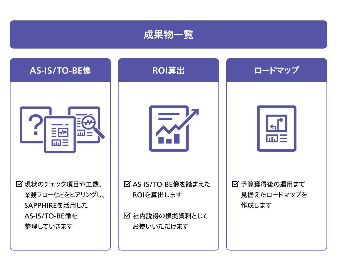 まずは現場の方から詳細なヒアリングを実施し、課題を抽出・整理した上で、課題解決のためのブループリントを作成します。さらに費用対効果・コスト削減効果を算出するなど、課題解決までのロードマップを作成するサービスとなっております。
