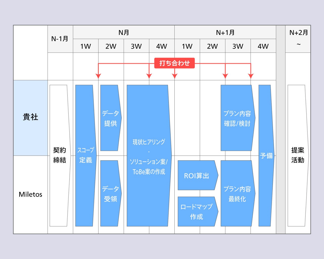 2ヶ月間で、現状のヒアリングをさせていただきながら、課題解決の道筋を作成していきます。