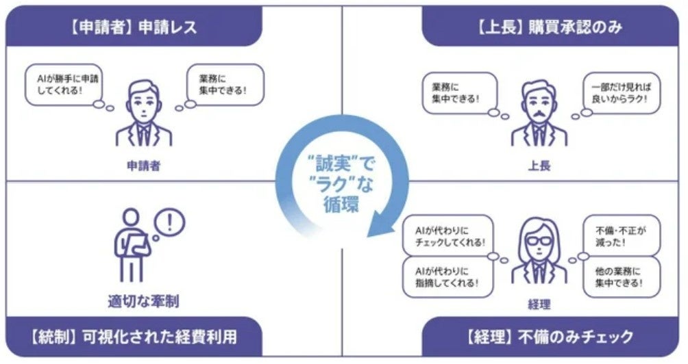 経費精算プロセスそのものを再設計することで「正の循環」を生み出し、各プロセスからできる限り「人手」を排除し、効率化と統制強化、コスト削減を可能とします。