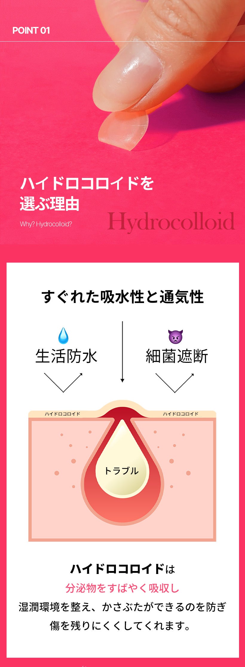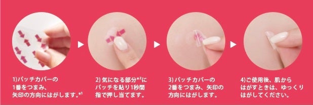 ONE,TWOクリーンタッチ"でお肌の接着面に触れずに貼れます。トラブルに直接触れる部分に手指のバイ菌もつかないので安心密着。ハイドロコロイドを使用したパッチなので安心してパッチの上からメイクが可能です。