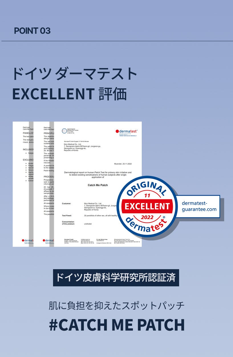 キャッチミーパッチは、韓国No.1ニキビパッチメーカーのニコメディカル社がオリジナル商品として韓国で初めてハイドロコロイドを使用し、開発したニキビパッチ製品です。