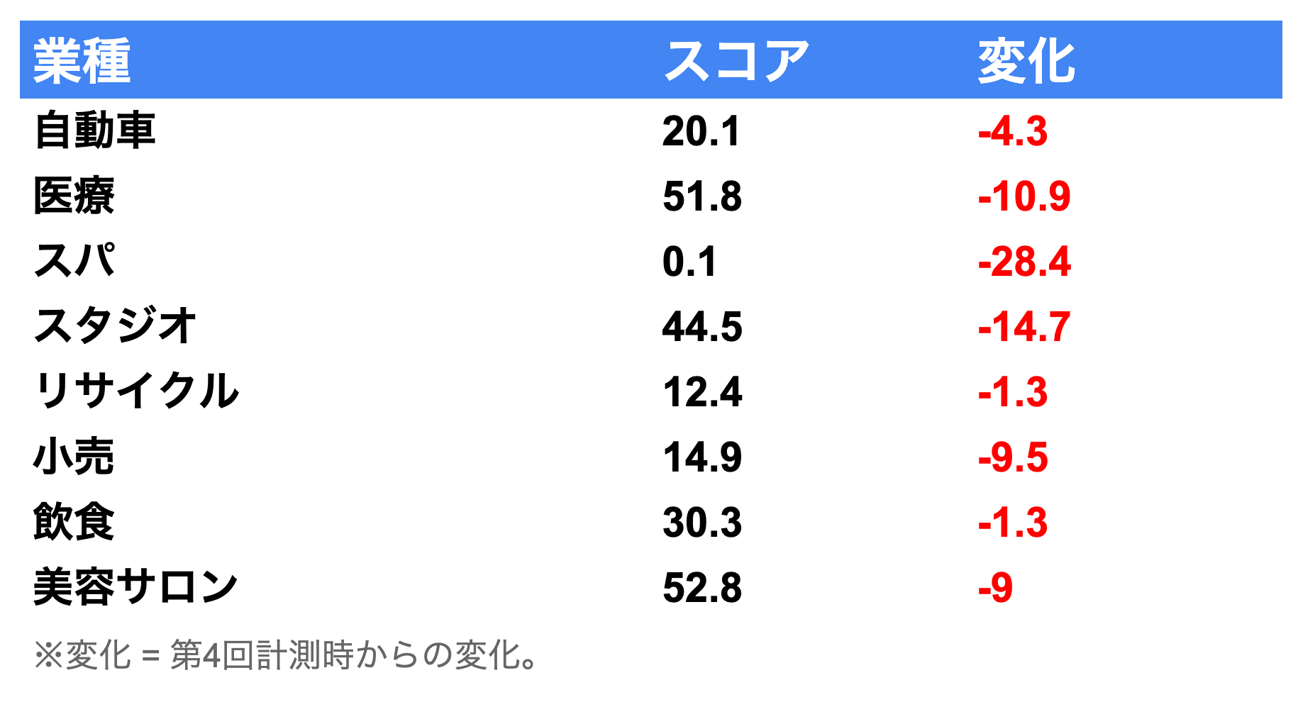 今回、第4回からの変化が大きかったのが、スパ及びスタジオ業界でした。各店舗ごとに変動の理由はそれぞれに存在しているため具体的な言及は難しいですが、高評価・低評価が入る際には全体的に以下の傾向が見られました。
