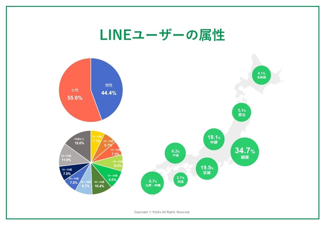 現在LINEの月間アクティブユーザー数は9,300万人と他SNSと比較しても圧倒的に多く、そのようなLINEの利用状況と相まって、LINEを活用したキャンペーンを実施する企業やブランドが年々増加しております。また、LINEのアクティブユーザーの属性は日本の人口分布とほとんど変わらないため、LINEでキャンペーンを行うことで日本国内における幅広い年齢・地域の方に対してアプローチを行うことが可能になります。