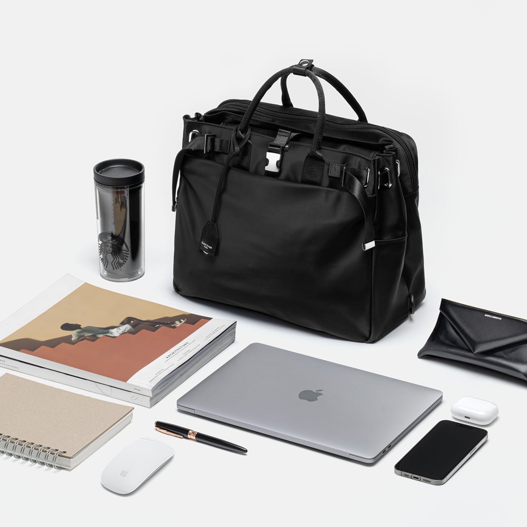 ハンディー、リュック、ショルダーの3Way仕様に加え、A4の書類と15インチのノートPCが収納できる広さもあり、仕事用品とプライベート用品を分けられる2層式構造になっています。