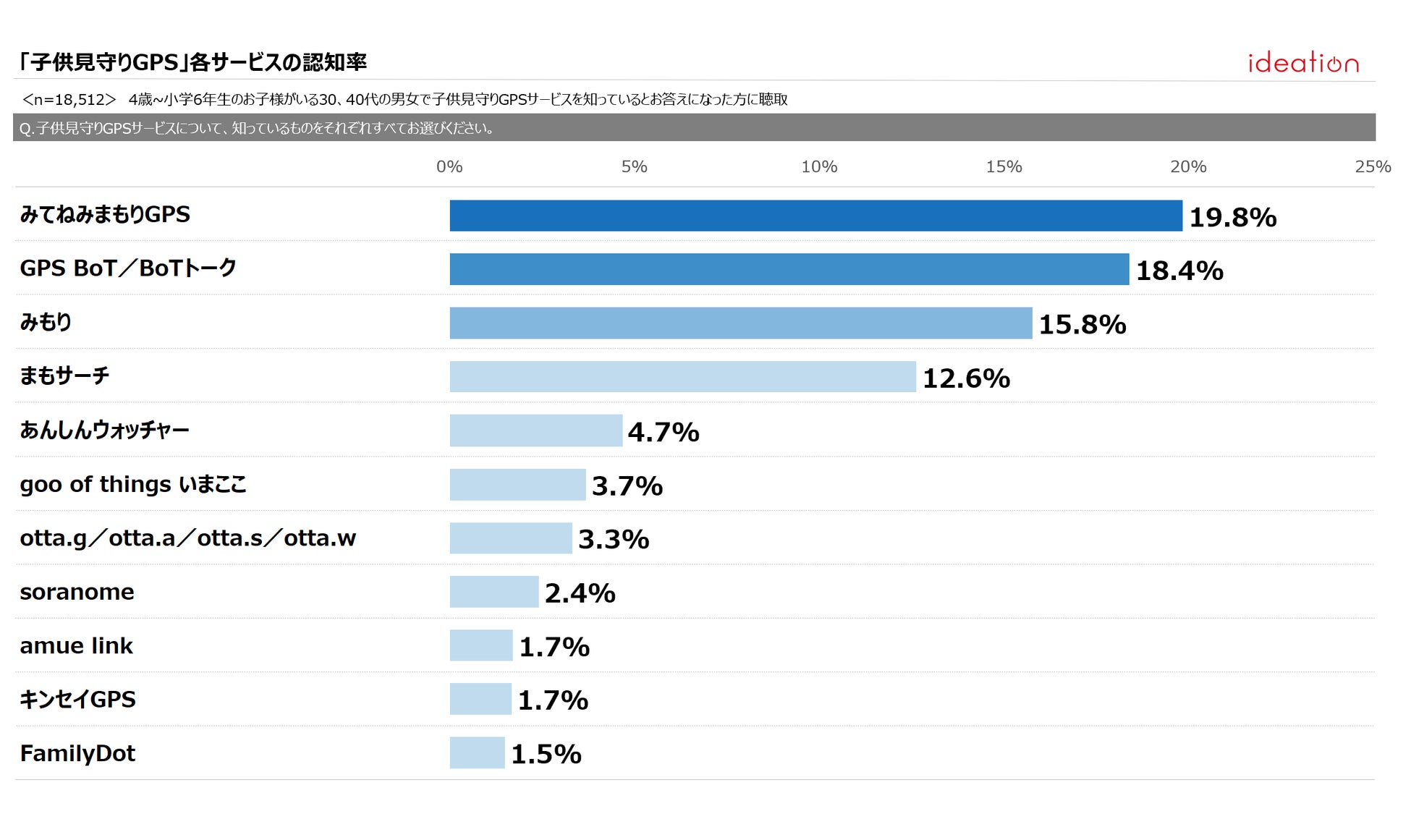 各サービスの認知度は、1位が「みてねみまもりGPS」(19.8%)、2位が「GPS BoT/BoTトーク」(18.4%)、3位が「みもり」(15.8%)、4位がまもサーチ(12.6%)で、上位4サービスは10%を超える認知を獲得していることがわかった。