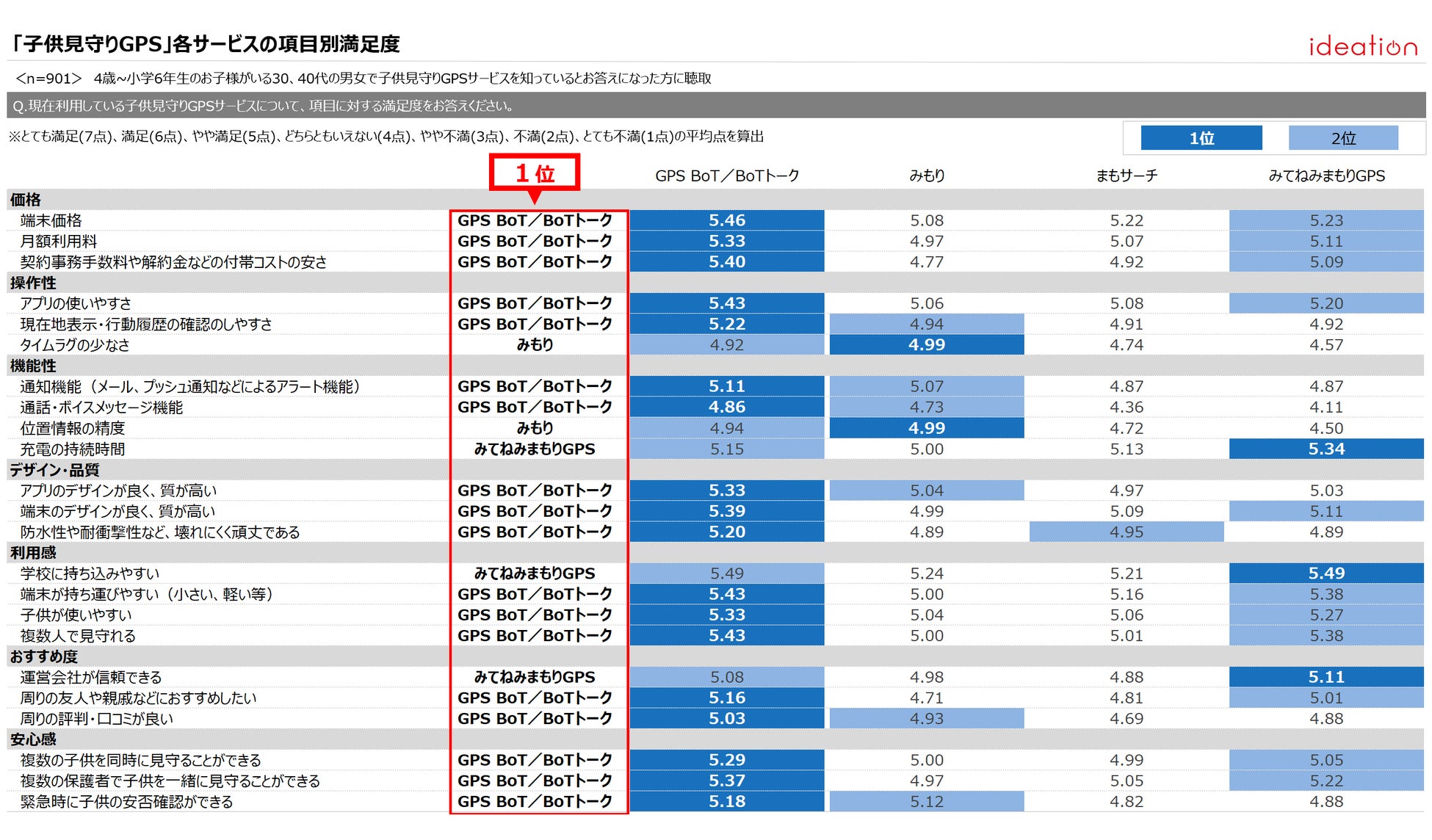 各サービスの項目別満足度については、総合満足度で1位の「GPS BoT/BoTトーク」が、全調査項目23項目の内、18項目で1位という結果だった。「GPS BoT/BoTトーク」は、端末価格やアプリの使いやすさ、またデザインや端末の持ち込みやすさといった、提供価格や機能等、幅広い面で高く評価されている。次に満足度の高い項目が多かった「みてねみまもりGPS」は、充電の持続時間などが評価された。