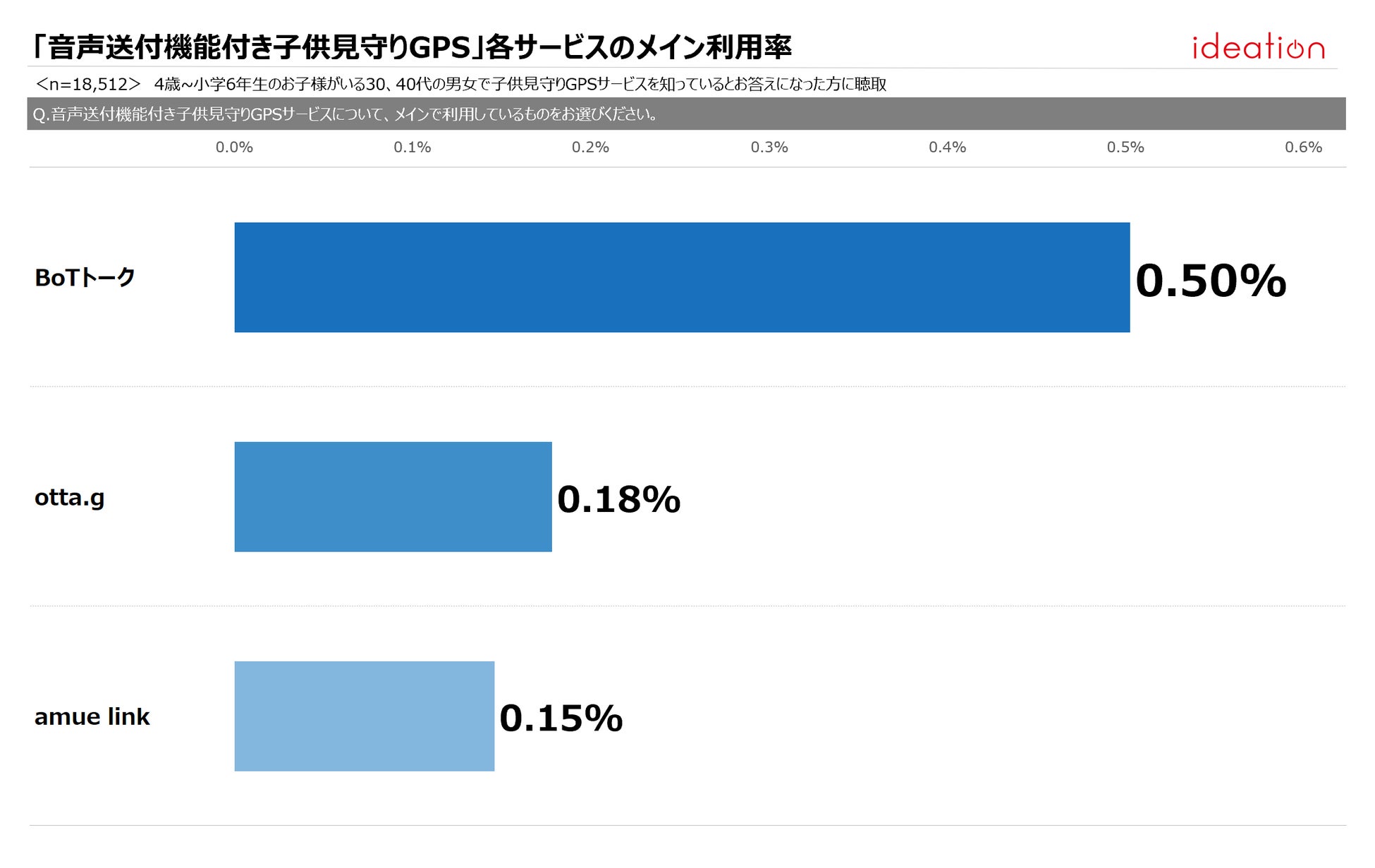 「音声送付機能付き子供見守りGPS」の3サービスで比較すると、「BoTトーク」のメイン利用率が最も高く0.50%であるが、「音声送付機能付き子供見守りGPS」の利用が浸透してきているとは言えず、今後の普及に期待が高まる。