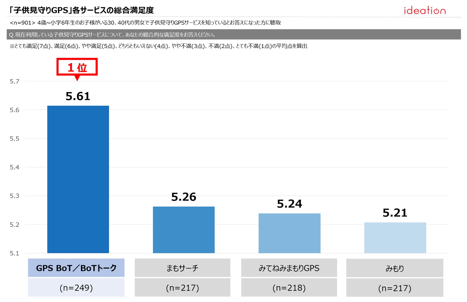 各サービスの総合満足度については、とても満足、満足、やや満足、どちらともいえない、やや不満、不満、とても不満の7段階で質問し、平均点を算出した結果、「GPS BoT/BoTトーク」が5.61点で1位となり、他サービスと比較して、満足度が高いことが見て取れる。