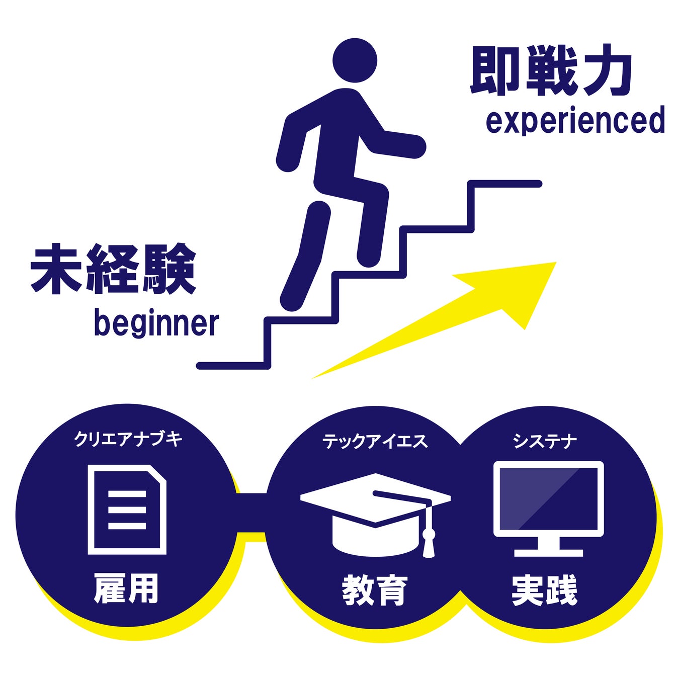 地方企業のIT人材不足の深刻化と、未経験のITエンジニアの就職の均衡がうまく取れていない現状を鑑み、クリエアナブキは2社と協力し、テックアイエスでのプログラミング教育と当社での雇用およびシステナ松山イノベーションラボでの実務経験を融合した「ITエンジニア育成・就業プロジェクト」を導入しました。