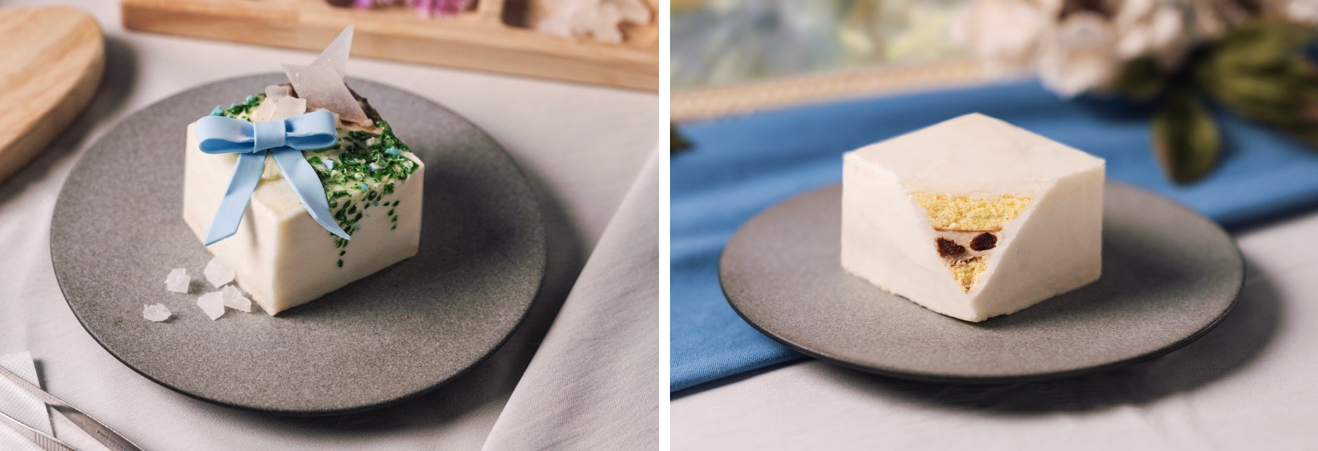 キャンバスに見立てた真っ白なバターケーキには、ラムレーズンを混ぜ込んだコーヒークリームをサンドしました。バターはすべてカルピスバターを使用しており、軽い口当たりで、ドリンクと合わせてお楽しみ頂けます。