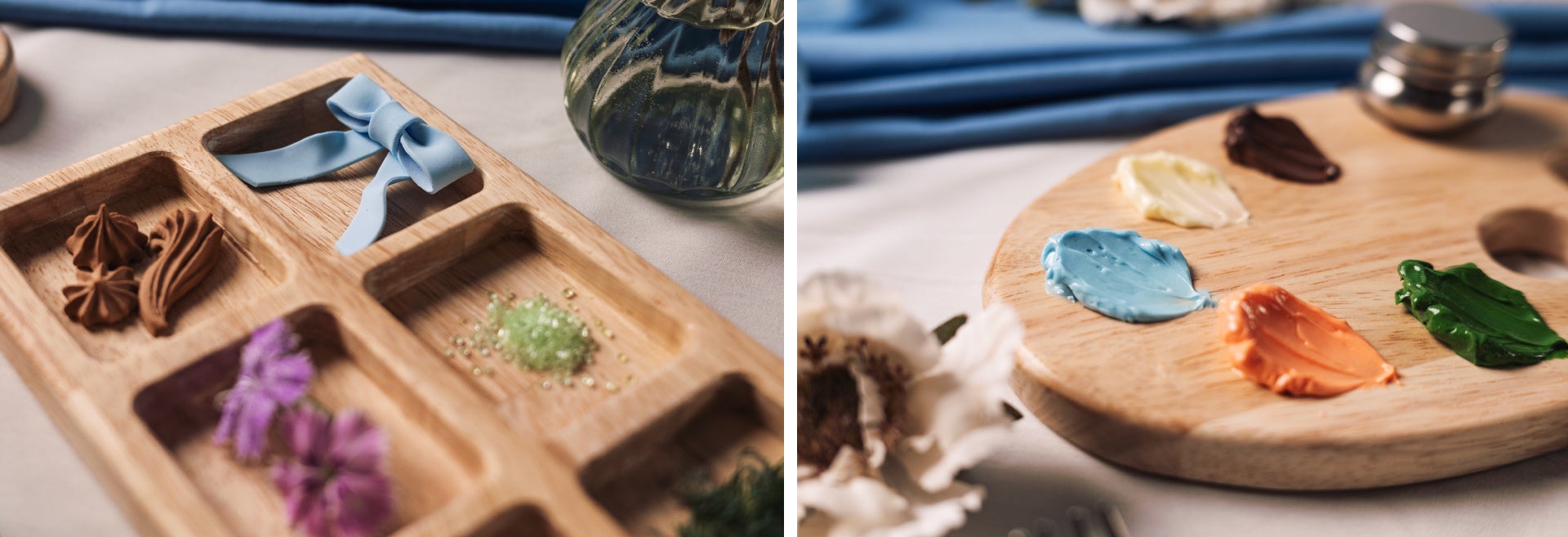 パレットに並ぶ絵の具に見立てたそれぞれ異なるフレーバーのバタークリームや、イレーヌの髪飾りやドレスをイメージしたシュガークラフトのリボンなどで自分だけの《イレーヌ・カーンダンヴェール嬢》を表現して頂けます。