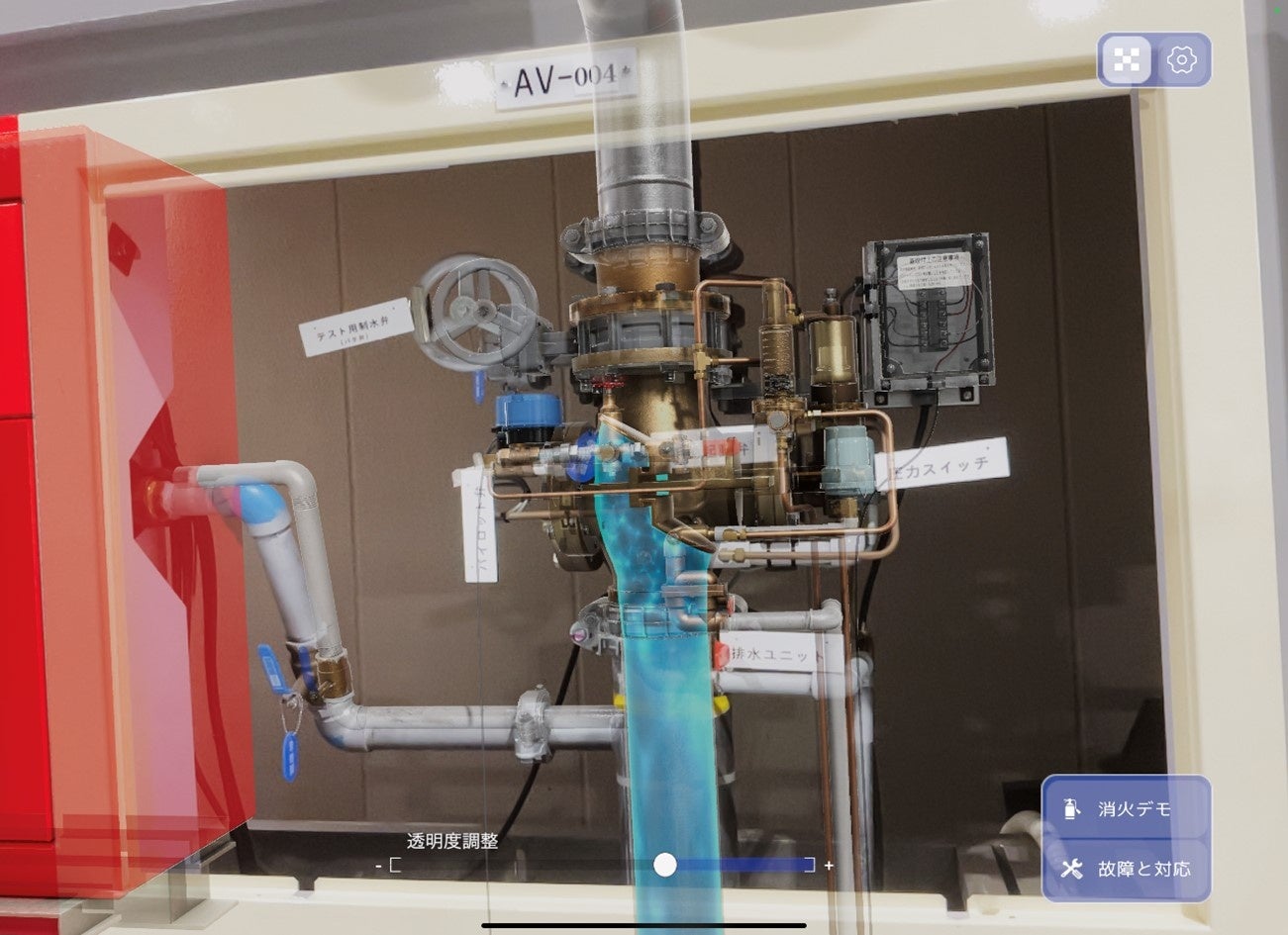 デジタルツイン技術により、車両火災発生から放水までの機器動作を再現し、自動弁装置内部のバルブの動きや水の流れなどの内部構造を可視化、動作不良時の調査ポイントや復旧方法の習得が可能な疑似再現機能も追加することで、更なる理解度の向上が可能となりました。