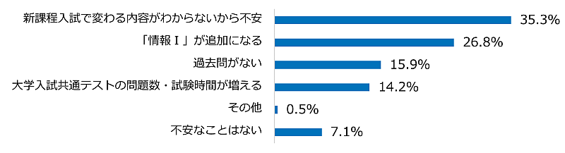 高校1年生と2年生に対して、2025年度からの新課程入試について質問したところ、9割以上が何らかの不安を感じていることがわかりました。特に35.3%は「新課程入試で変わる内容がわからないから」と答え、漠然とした不安を抱えている高校生が最も多い結果となりました。また、大学入学共通テストへの「情報Ⅰ」の追加や過去問がないことなど、誰も経験していない入試に対し、対策の不明瞭さに不安を感じていることがうかがえます。