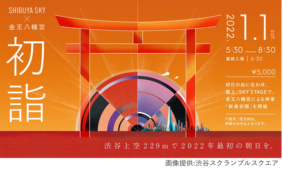 「渋谷スクランブルスクエア」の14階・45階・46階・屋上にある展望施設「SHIBUYA SKY (渋⾕スカイ)」で開催する、初日の出を鑑賞する特別イベント。初日の出に合わせ、屋上展望空間「SKY STAGE」に特別祭壇を設け、金王八幡宮による神事「新春祈願」も執り行います。渋谷最高峰、地上229mに位置するSHIBUYA SKYで、2022年の幕開けに思いを新たにする特別な時間をお過ごしください。