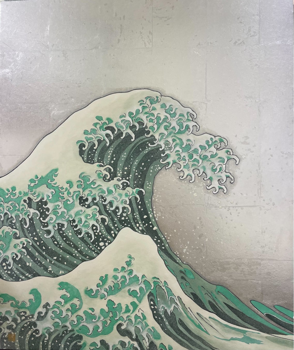 これからも国や時代を超えた海のアイコンであり続けるその存在を、永遠不変の輝きを放つプラチナ箔の中で立ち上がる 「VAGUES VERTES JADE(翡翠の波)」として、緑青(孔雀石)や胡粉などの天然顔料で丁寧に描き上げました。