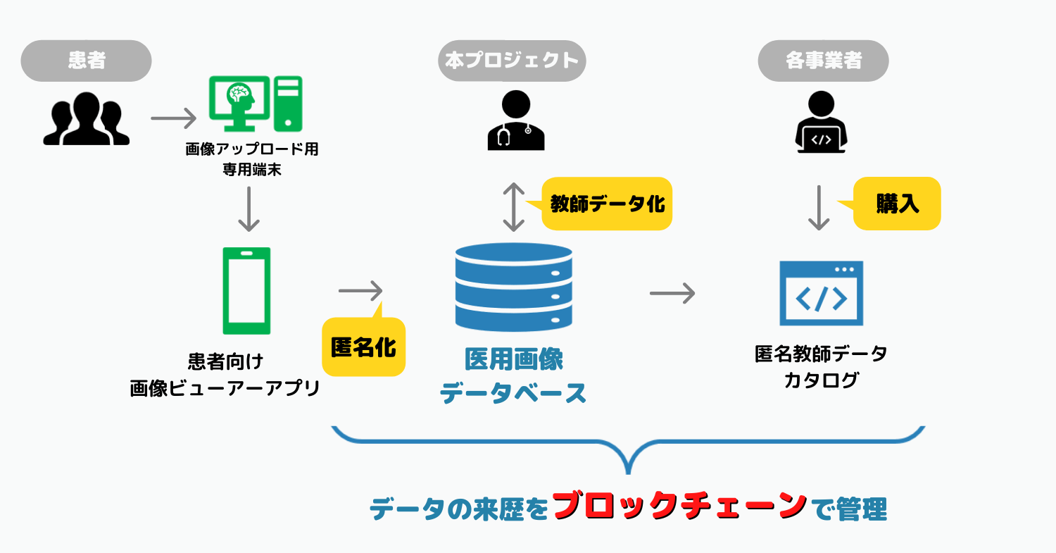 昨今、AIや人工知能が発展していく中でどのようにデータを安全な仕組みで利用していくかが課題として挙げられます。これは、情報セキュリティに対する高い要求のほか、大量のデータ処理、またシステムが稼働し続けるための安定性・持続性などを全て同時に達成する必要があるためです。今回、データ流通が最も困難とされる医療分野において人工知能社会に向けたデータ流通市場を確立し、医用画像分野でのAI開発・活用と個人がより最適化された医療サービスを受けることを実現可能にするために、これまで金融業界で培った大容量のデータ処理技術及び高度なセキュリティ技術を転用し、さらにブロックチェーンを活かすことで医療業界の発展に向けたテクノロジーによる課題解決を図ってまいります。