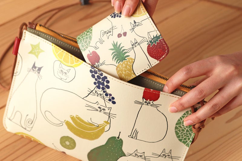 ⼤阪府茨⽊市で⾰⼩物の製作・販売をするクアトロガッツ (代表:中辻⼤也ナカツジヒロヤ)は2⽉1⽇から公式HPにて”猫祭り”を開催しています。企画の一つとしてグラフィックデザイナーYOSHIDAKE(ヨシダケ)とコラボアイテムを発売中です。価格は、⼩さい財布「猫と果実」14,800円(税込16,280円)⼩さいかばん「猫と果実」14,800円(税込16,280円) https://quatrogats.com/?mode=grp&gid=2528088