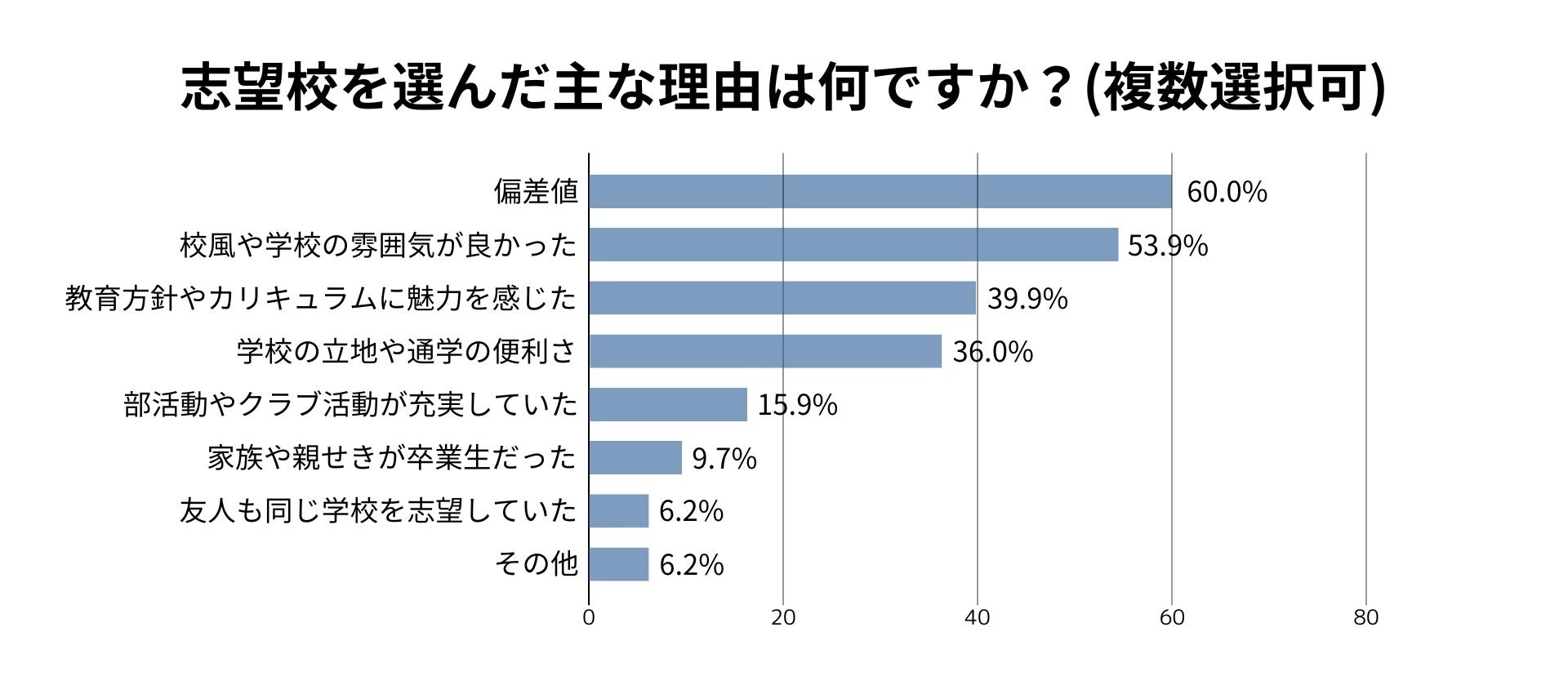 この結果を見ると、志望校選びの際には偏差値を重視する傾向がありますが、校風や教育方針、立地など偏差値以外の要素に関してもよく考慮されていることがわかります。