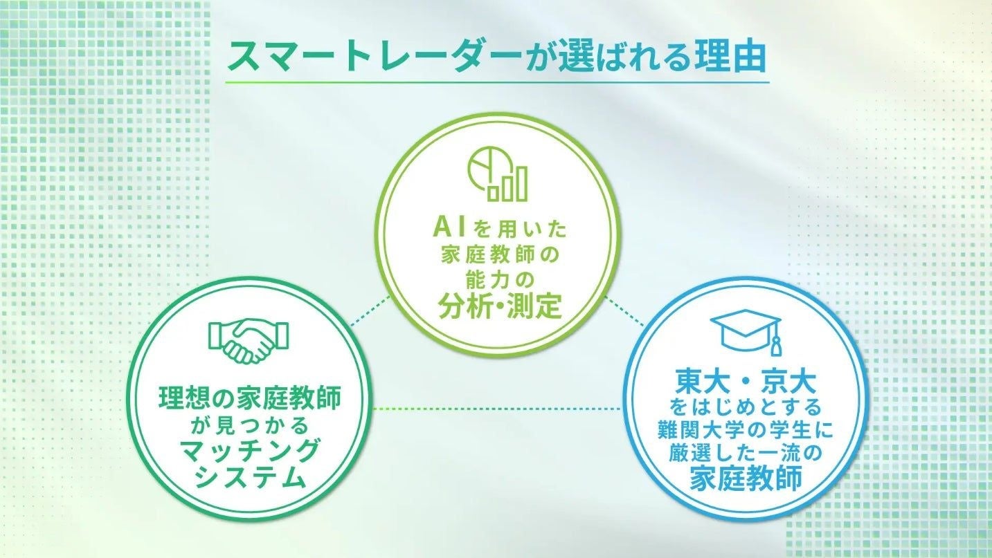 スマートレーダーはAIによって家庭教師の能力や指導力を科目ごとに定量的に測定し、総合的な判断で家庭教師を評価し授業料を決定するCtoCプラットフォームです。スマートレーダーの主な特徴として以下の3つが挙げられます。