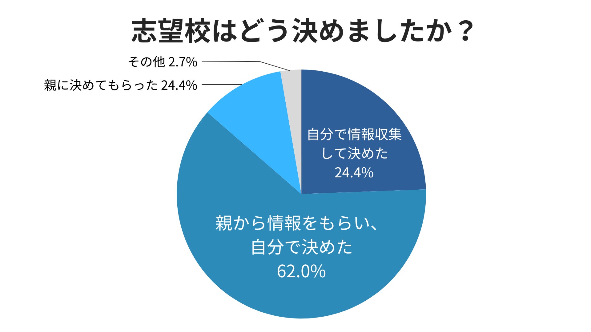 調査結果によると、「親から情報をもらい、自分で決めた」人が62.0%で最も多く、「自分で情報収集して決めた」人が24.4%で次に多く、合わせると86.4%の人が自分で志望校を決めていることがわかりました。