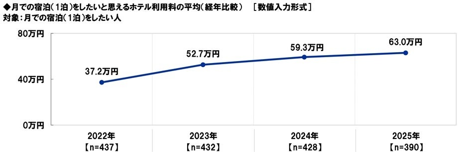 月での宿泊(1泊)をしたいと思えるホテル利用料の平均は、調査開始以降上昇傾向がみられ、2022年37.2万円→2025年63.0万円と25.8万円の上昇となりました。