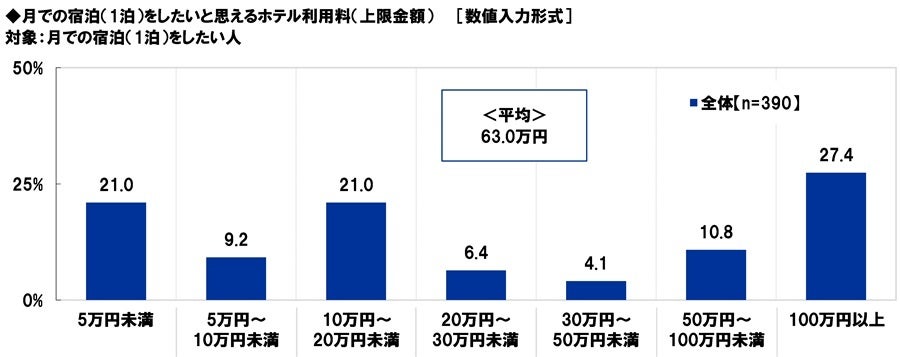 月での宿泊(1泊)をしたい人(390名)に、そうしたいと思えるホテル利用料(上限金額)を聞いたところ、「5万円未満」や「10万円~20万円未満」(いずれも21.0%)、「100万円以上」(27.4%)に回答が分かれ、平均は63.0万円でした。