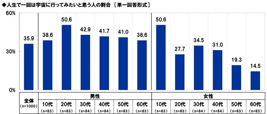 宇宙への憧れ 「人生で一回は宇宙に行ってみたい」36%、20代男性と10代女性では50%超え