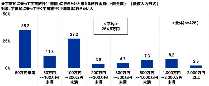 宇宙船に乗って行く宇宙旅行(1週間)に行きたい人(426名)に、そうしたいと思える旅行金額(上限金額)を聞いたところ、「50万円未満」(35.2%)や「100万円~200万円未満」(27.2%)に回答が分かれ、平均は264.5万円でした。