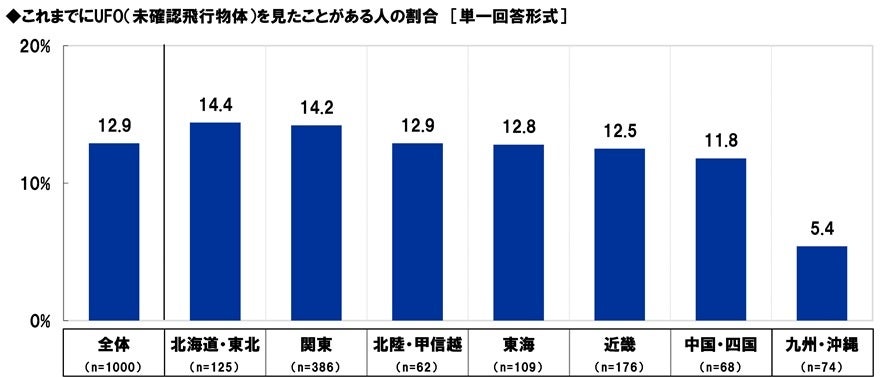 エリア別にみると、UFOを見たことがある人の割合が最も高くなったのは北海道・東北(14.4%)、最も低くなったのは九州・沖縄(5.4%)でした。