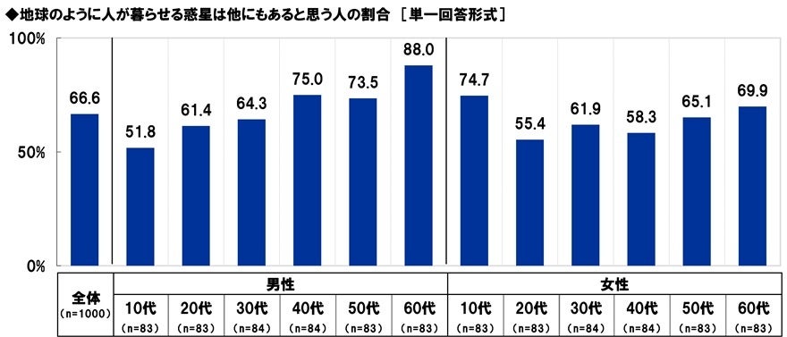 「地球のように人が暮らせる惑星は他にもあると思う」67%、60代男性では88%