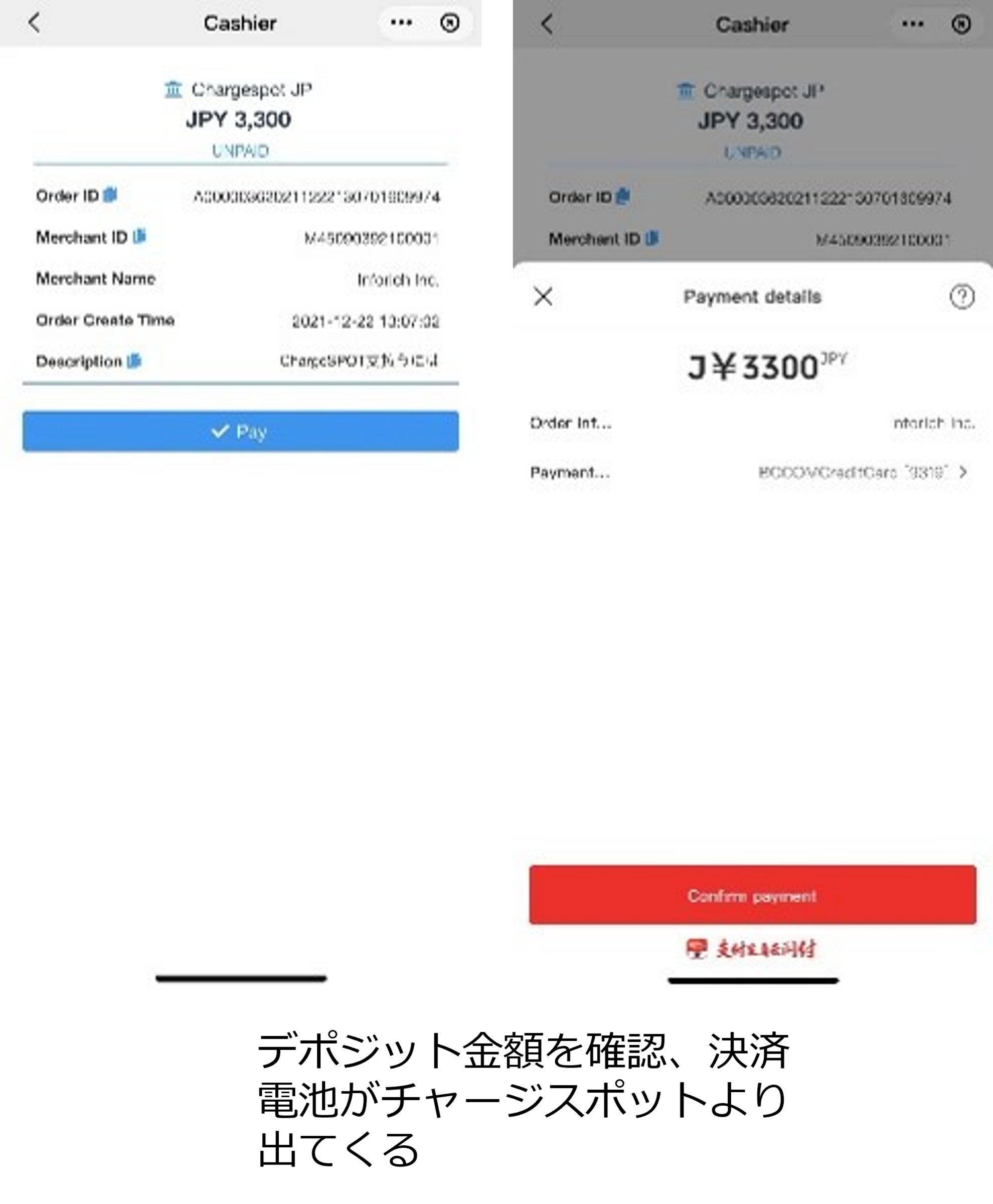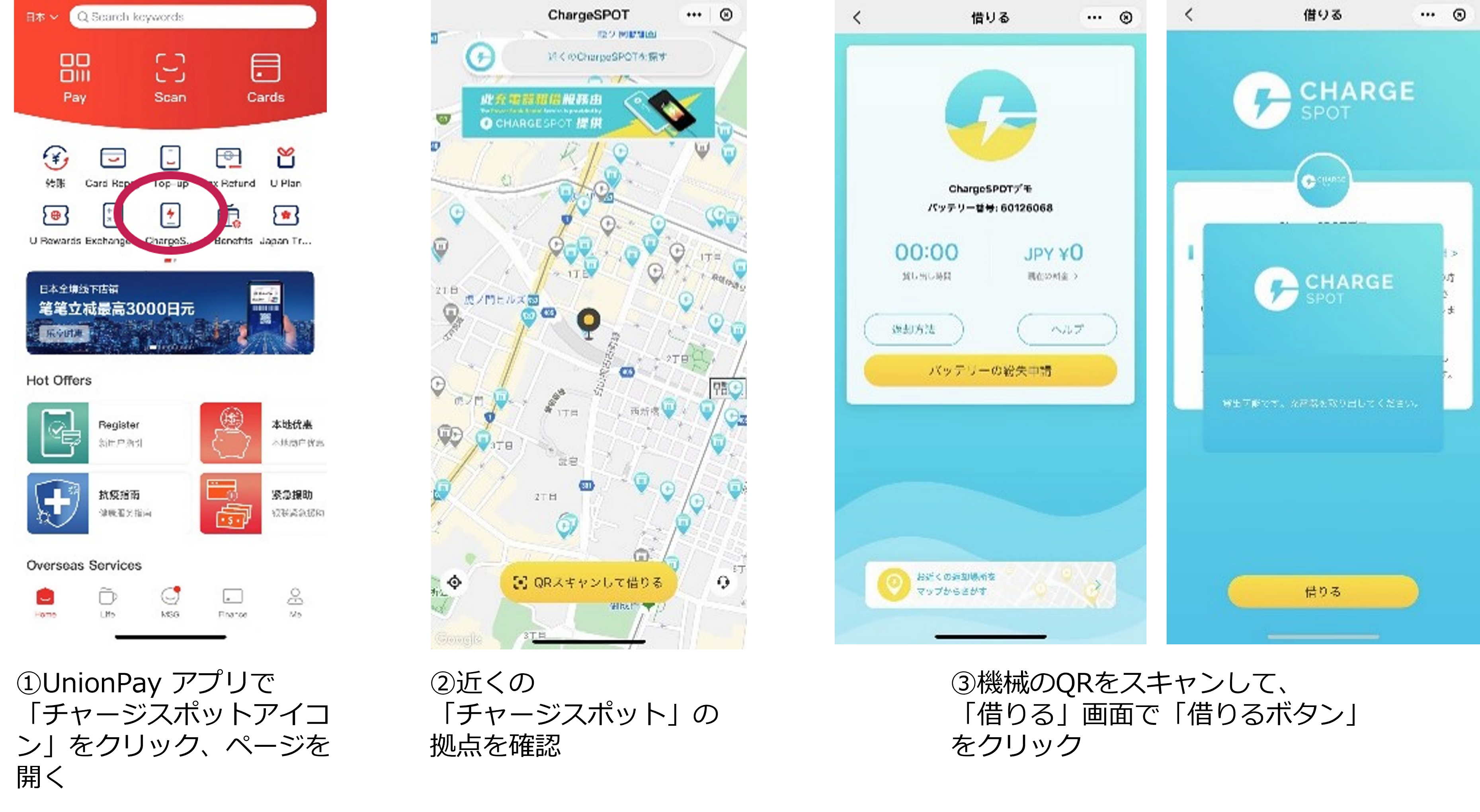 このたびの提携により、UnionPayアプリから「ChargeSPOT」の検索や貸出手続き、支払いが可能となります。