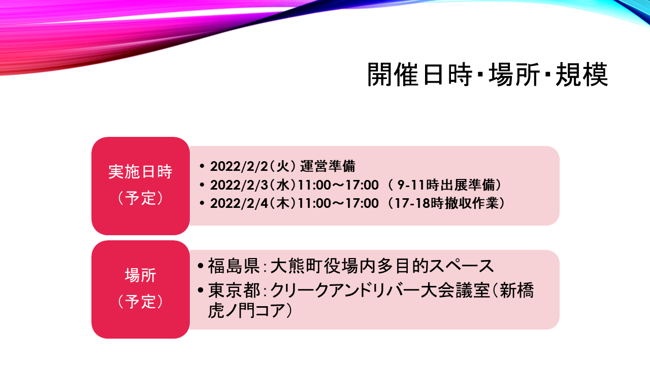2022年2月3日、2月4日の両日において、福島県双葉郡大熊町内の本会場と東京都内のサテライト会場を結び、また各地のオフィスやご自宅からもご参加いただける展示会の開催が決定しましたので、ご報告いたします。