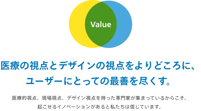 バリュー:医療の視点とデザインの視点をよりどころに、ユーザーにとっての最善を尽くす。