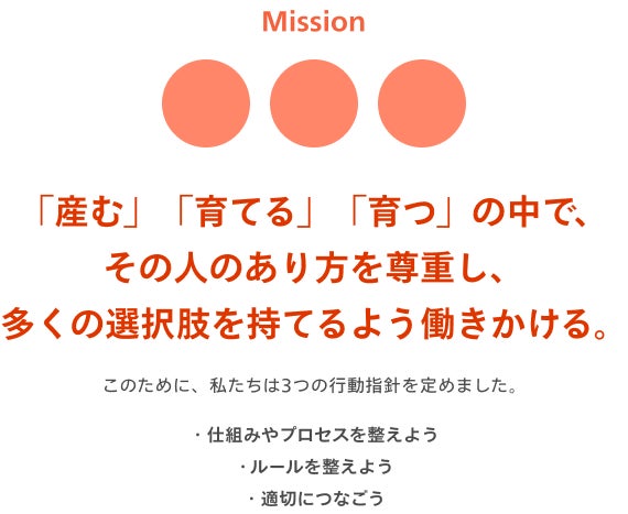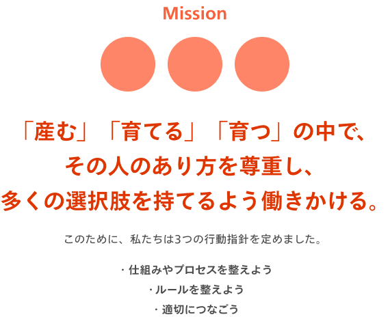 ミッション:「産む」「育てる」「育つ」の中で、その人のあり方を尊重し、多くの選択肢を持てるよう働きかける。