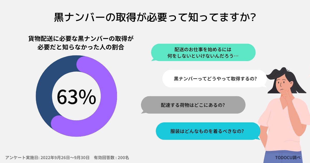 - 一方で、配送業務を行うには黒ナンバーの取得が必要となるが、それを知っている人は37%にとどまっている。新規参入のハードルを下げる取り組みにより配送員の新たな働き方が広がる流れが広がる。